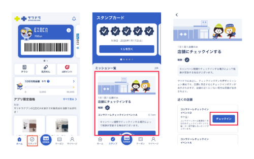 サツドラにご来店いただくと、1日1回1店舗でのみサツドラ公式アプリで「チェックインスタンプ」を押すことができる機能のこと。