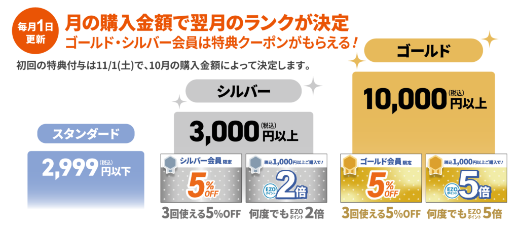 月初~月末までの1ヶ月間の購入金額によって、翌月のランク(ゴールド・シルバー・スタンダードの3つのどれか)が決定し、ゴールド・シルバー会員になると通常のクーポンに加えてお得なクーポンがもらえます!